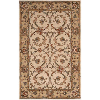 Adorned with a sophisticated pattern, this runner features a harmonious blend of beige and gold hues, creating a warm and inviting atmosphere in any hallway, entryway, or alongside your bed. The intricate design echoes classic aesthetics, seamlessly incorporating symmetrical scrollwork and botanical elements that speak to a refined taste.