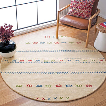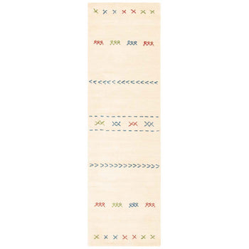 Our contemporary style runner boasts a serene cream base, providing a versatile and neutral backdrop that seamlessly integrates with any color scheme. Adorning this creamy canvas is a delightful pattern featuring rows of stylized motifs in a harmonious blend of colors that add a playful yet refined touch to the piece.