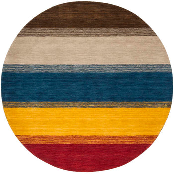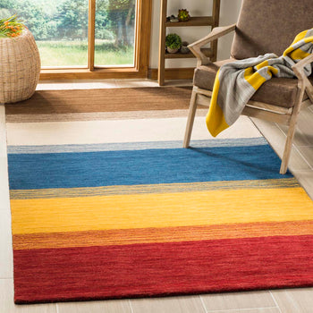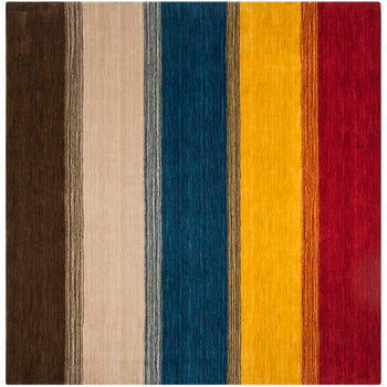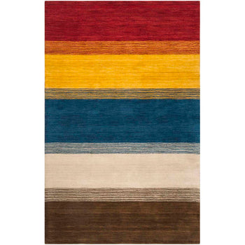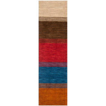 Each stripe in this rug tells a story?a spectrum of colors elegantly layered to form a tapestry that captivates and draws the eye. From the earthy browns to the deep blues, golden yellows, and hints of red, the seamless transition of colors mimics the serene progression of a sunset horizon.