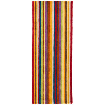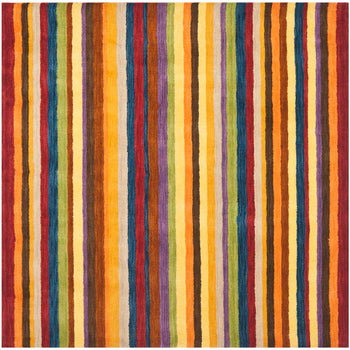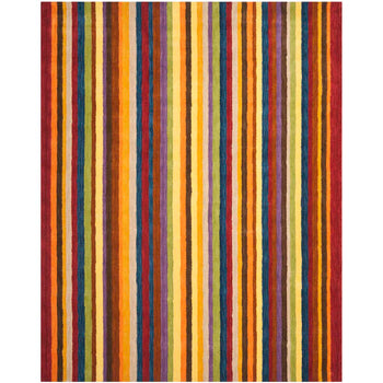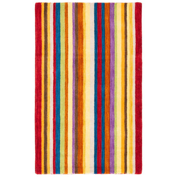 The rug's captivating pattern features bold, colorful stripes that run vertically, creating a visual feast of reds, yellows, purples, blues, and neutrals. This striking color palette ensures that the rug can complement various interior styles while making a statement. The high-quality wool and expert construction guarantee a resilient rug that can withstand the test of time, even in high-traffic areas.