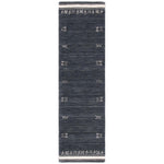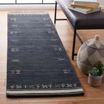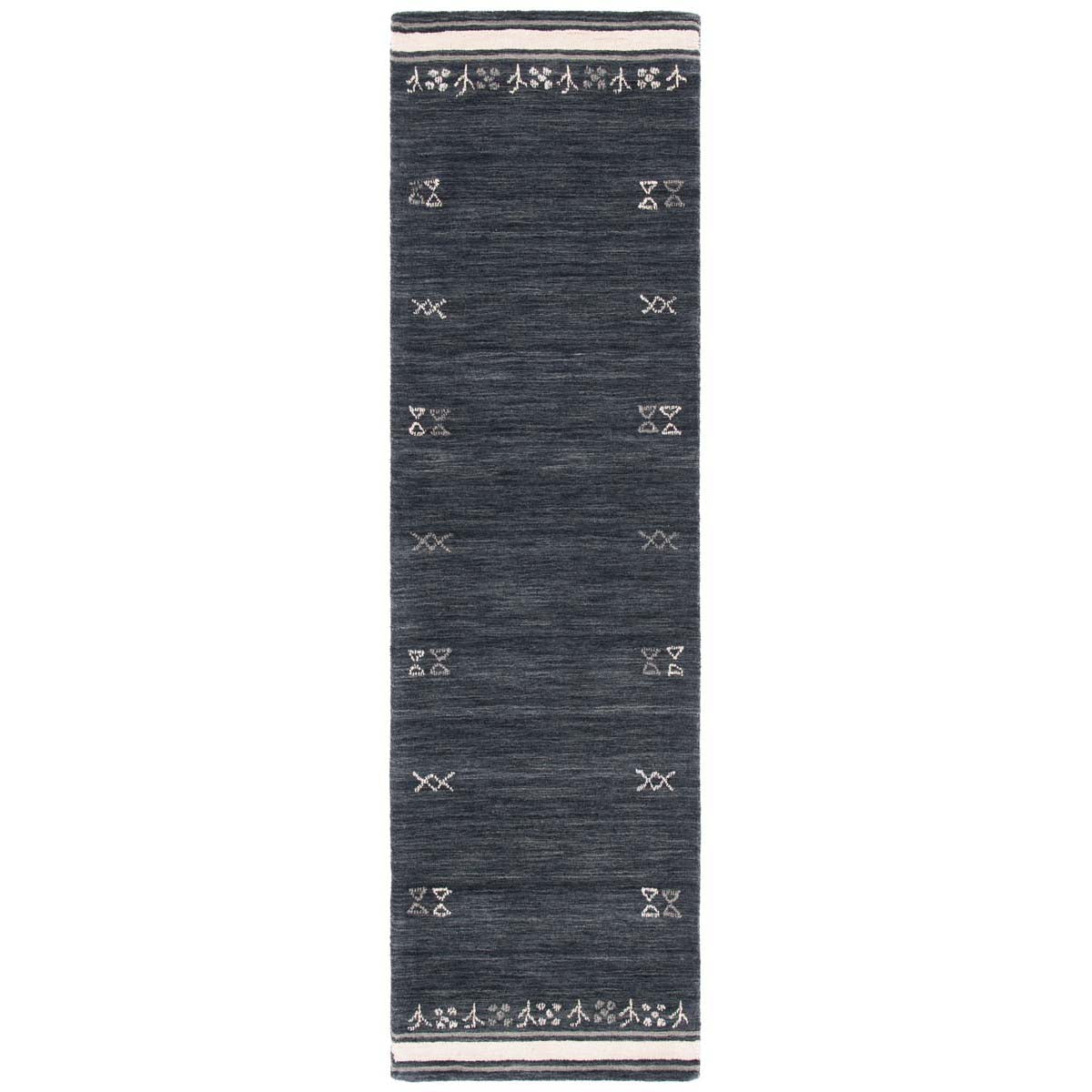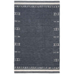 The charcoal color palette exudes elegance, while the rug's pattern introduces a subtle hint of cultural essence. Adorned with minimalist geometric borders and a series of diamond motifs, this rug captures the beauty of contemporary design while paying homage to traditional craftsmanship.