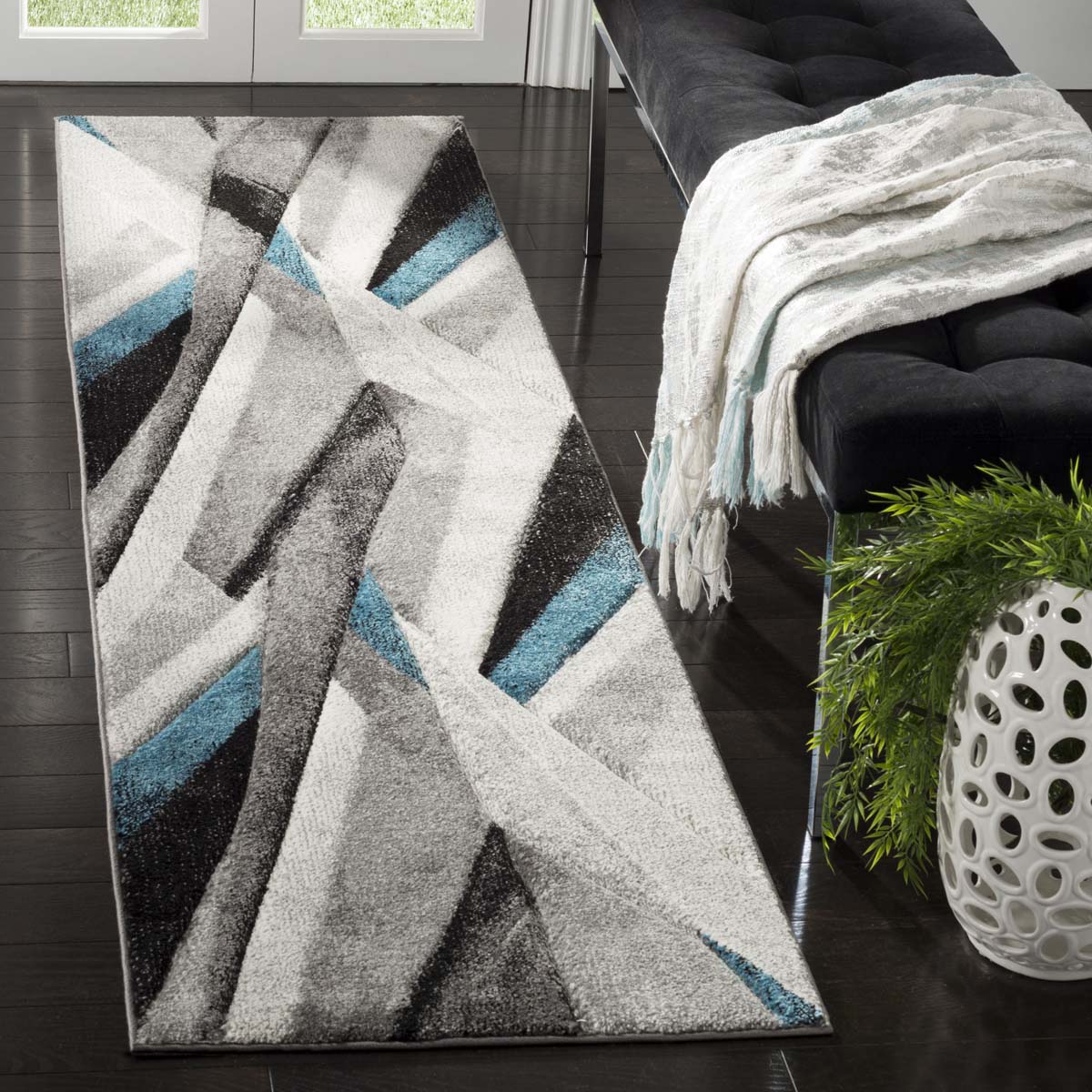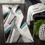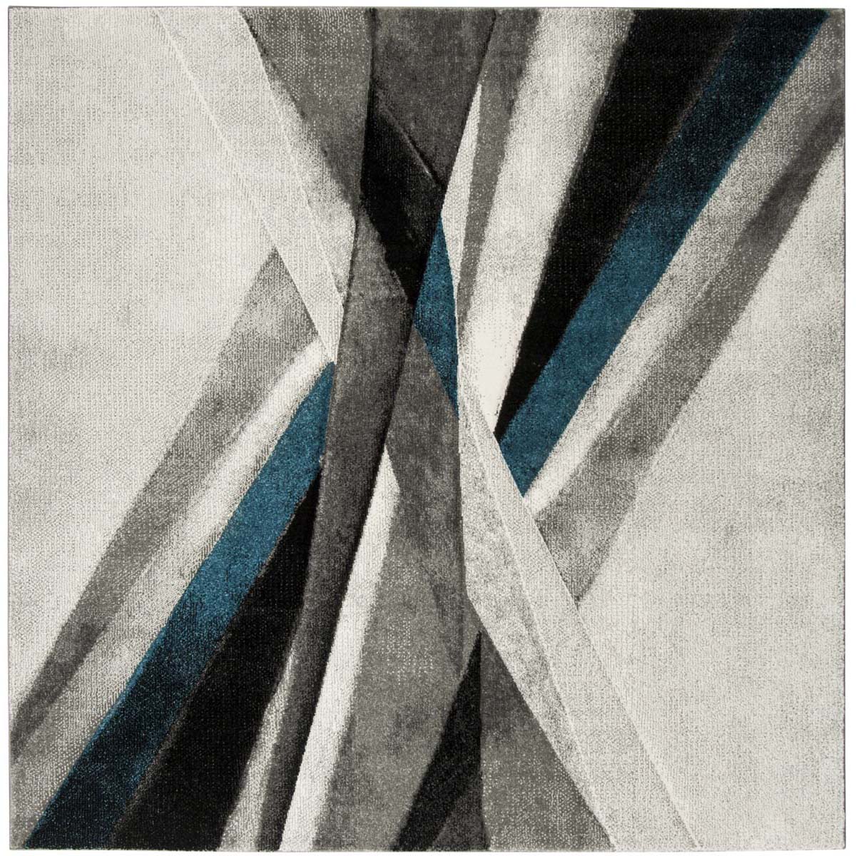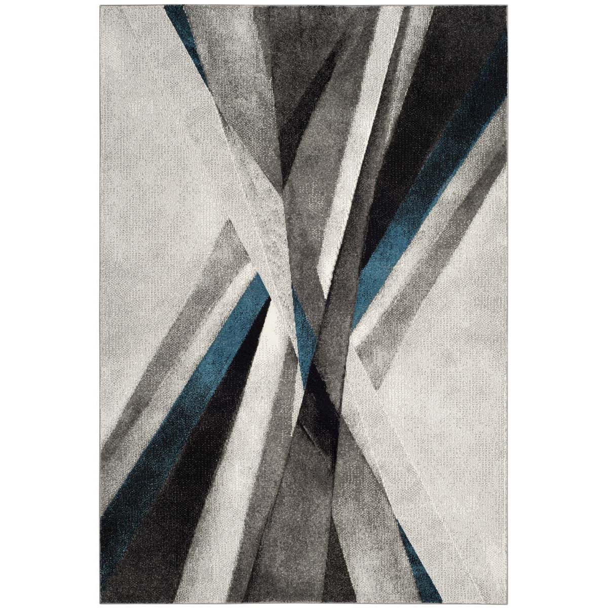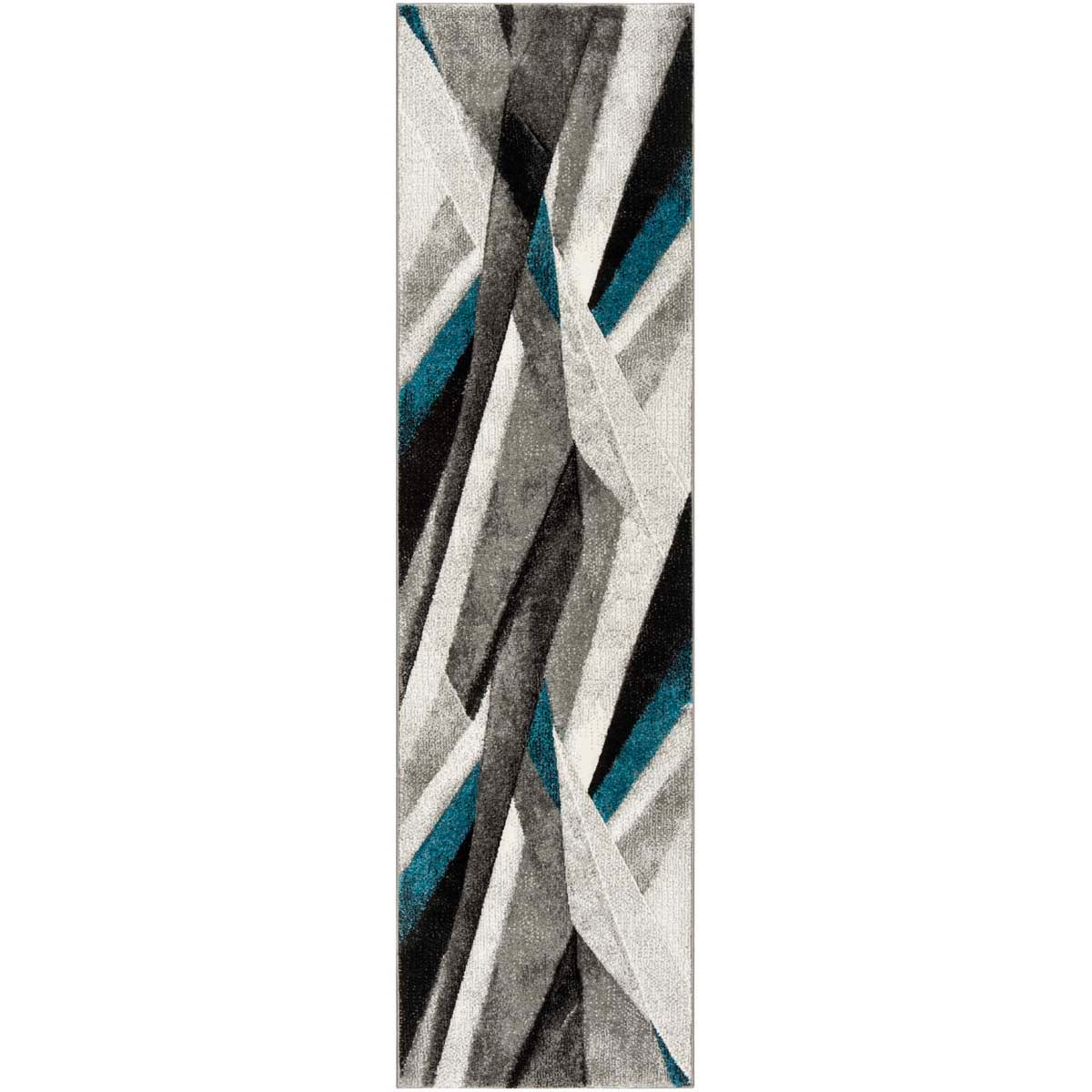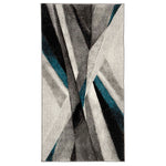 The intricate design, captured in hues of sophisticated grey with bold teal accents, adds a touch of artistic flair to your home decor. The dynamic angular lines create a sense of movement, bringing an energetic yet refined look to your favorite room. The pile height of a comfortable 5/8" makes for a soft underfoot experience while accentuating the sharpness of the pattern.