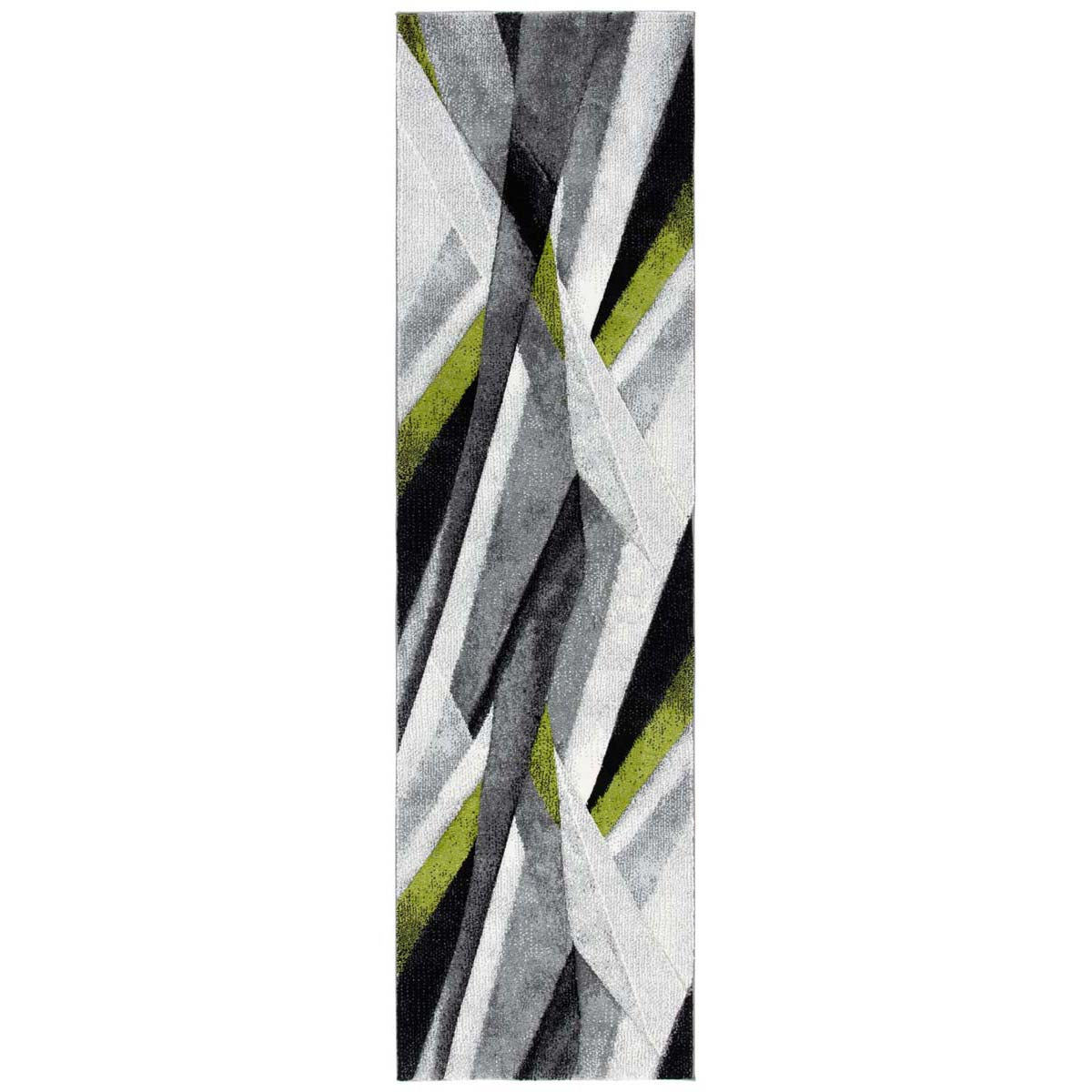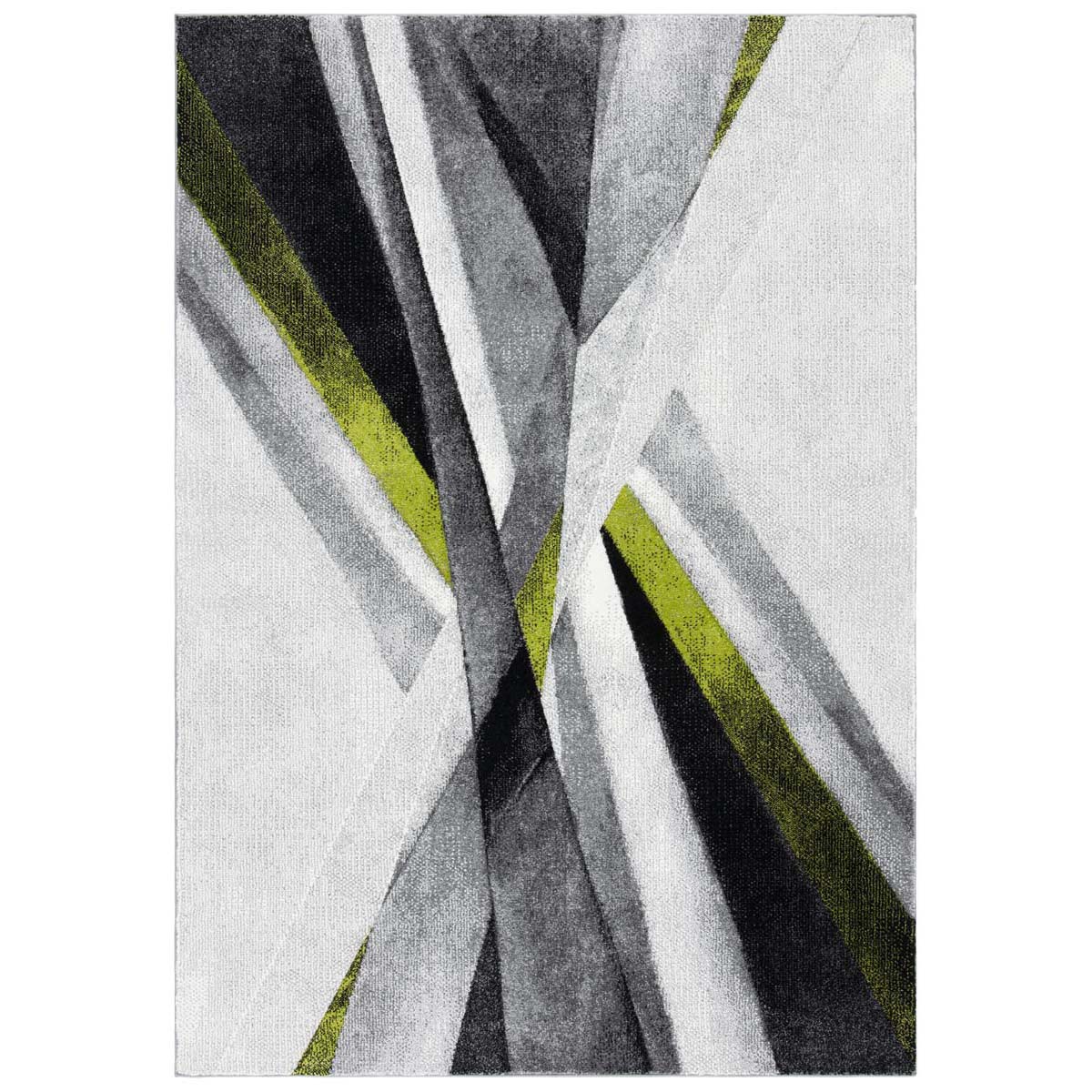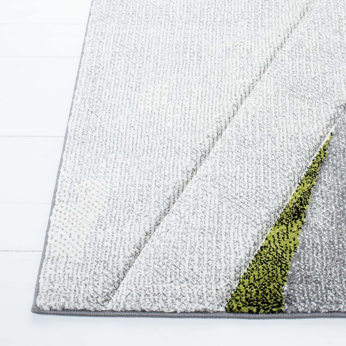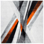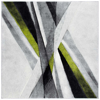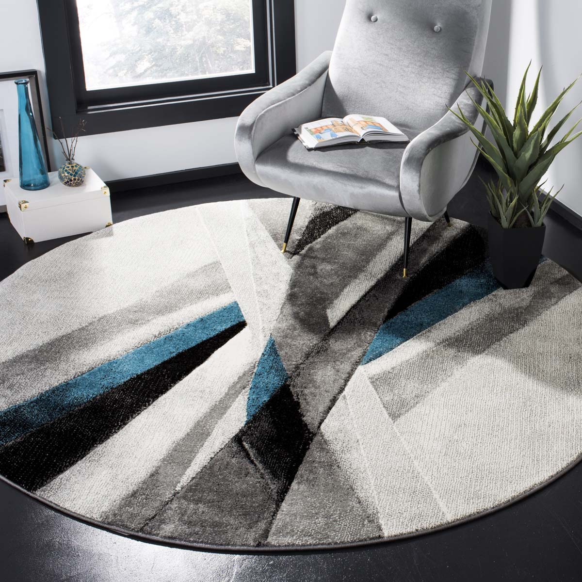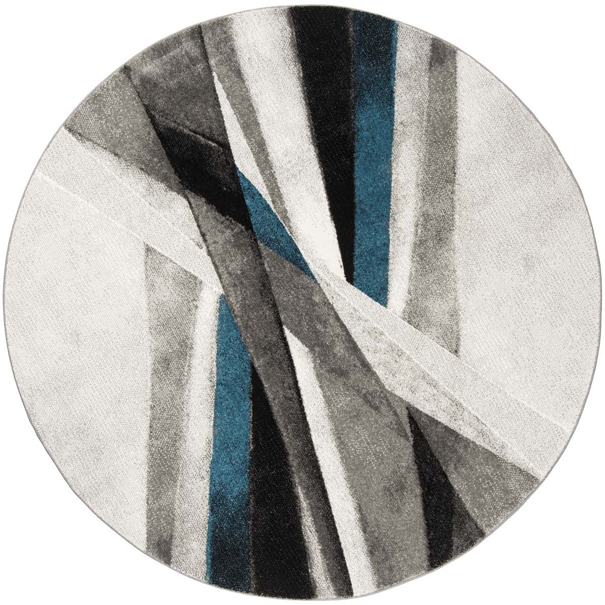 The intricate design, captured in hues of sophisticated grey with bold teal accents, adds a touch of artistic flair to your home decor. The dynamic angular lines create a sense of movement, bringing an energetic yet refined look to your favorite room. The pile height of a comfortable 5/8" makes for a soft underfoot experience while accentuating the sharpness of the pattern.