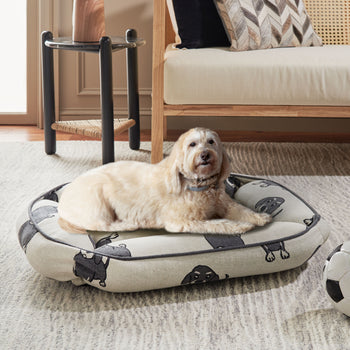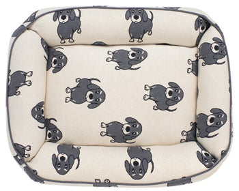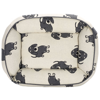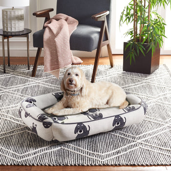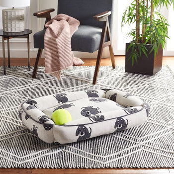 Introducing our Hound Dog Bed, a perfect blend of comfort and style for your furry friend. Crafted in India with expertise, this bed features a charming ivory and grey pattern of playful hounds offering a delightful touch to any room. It's an ideal size for small to medium breeds. The bed's cover is made of cotton, ensuring a soft and breathable surface, while the polyester filling provides plush support for your pet's joints and muscles. Function meets design as the rectangle shape complements any home decor, and the neutral color palette blends seamlessly with a variety of interior styles. Plus, the bed is easily washable, allowing you to maintain a clean and hygienic space for your pet. Choose our premium Dog Bed for a plush, soft resting place that is both washable and stylish, ensuring your pet's utmost comfort and your home's aesthetic.