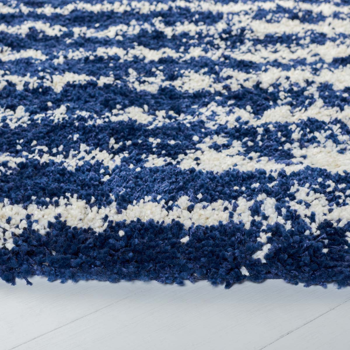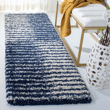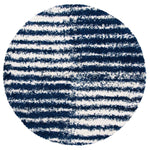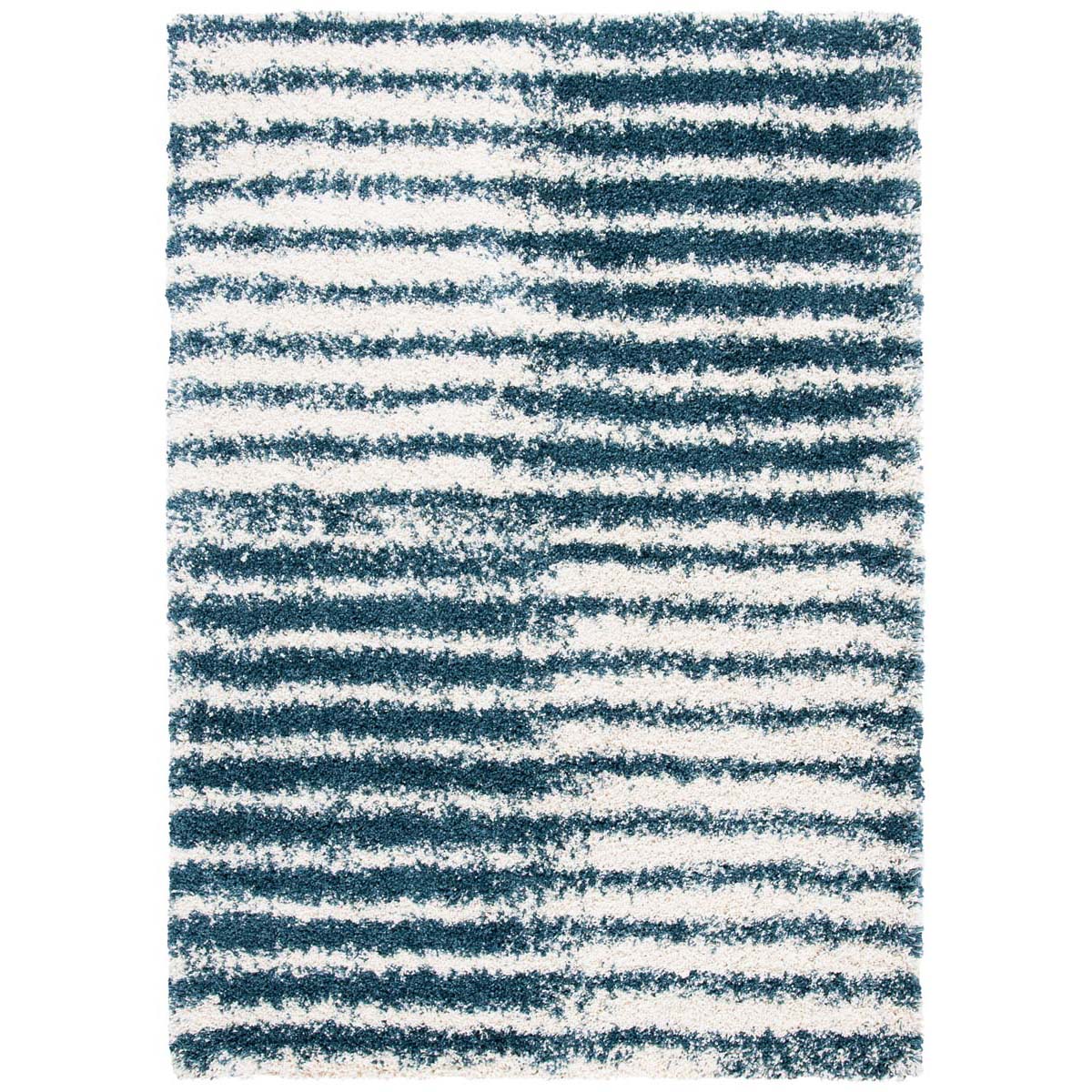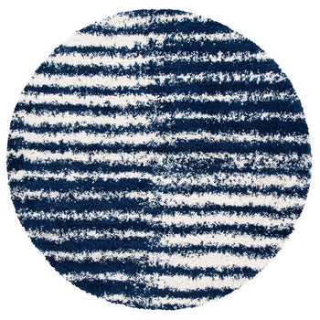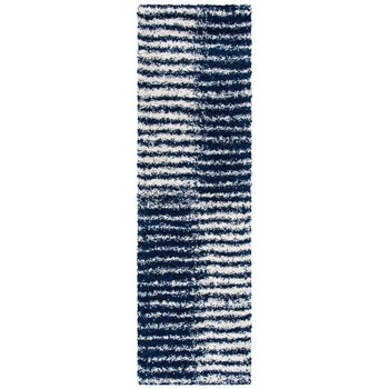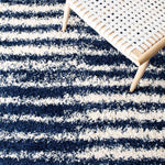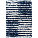 Introducing our plush and contemporary 3' X 5' small rectangle area rug, a beautiful addition to any room seeking a modern touch with a cozy feel. The bold navy and ivory hues blend harmoniously, featuring an engaging striped pattern that exudes a sense of rhythm and movement across the floor space.