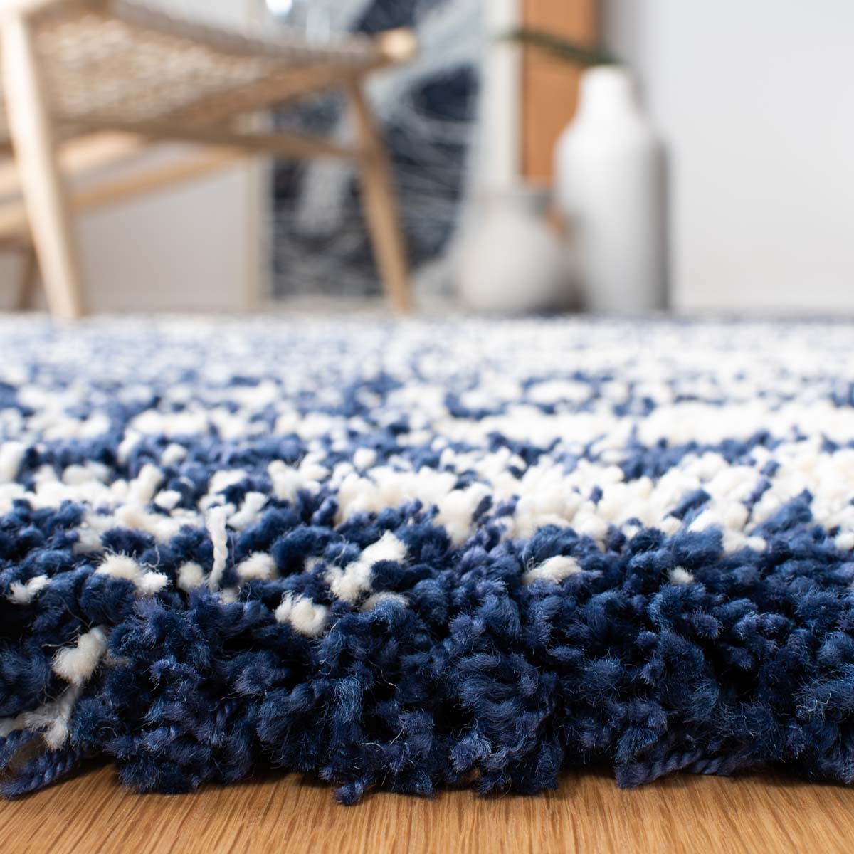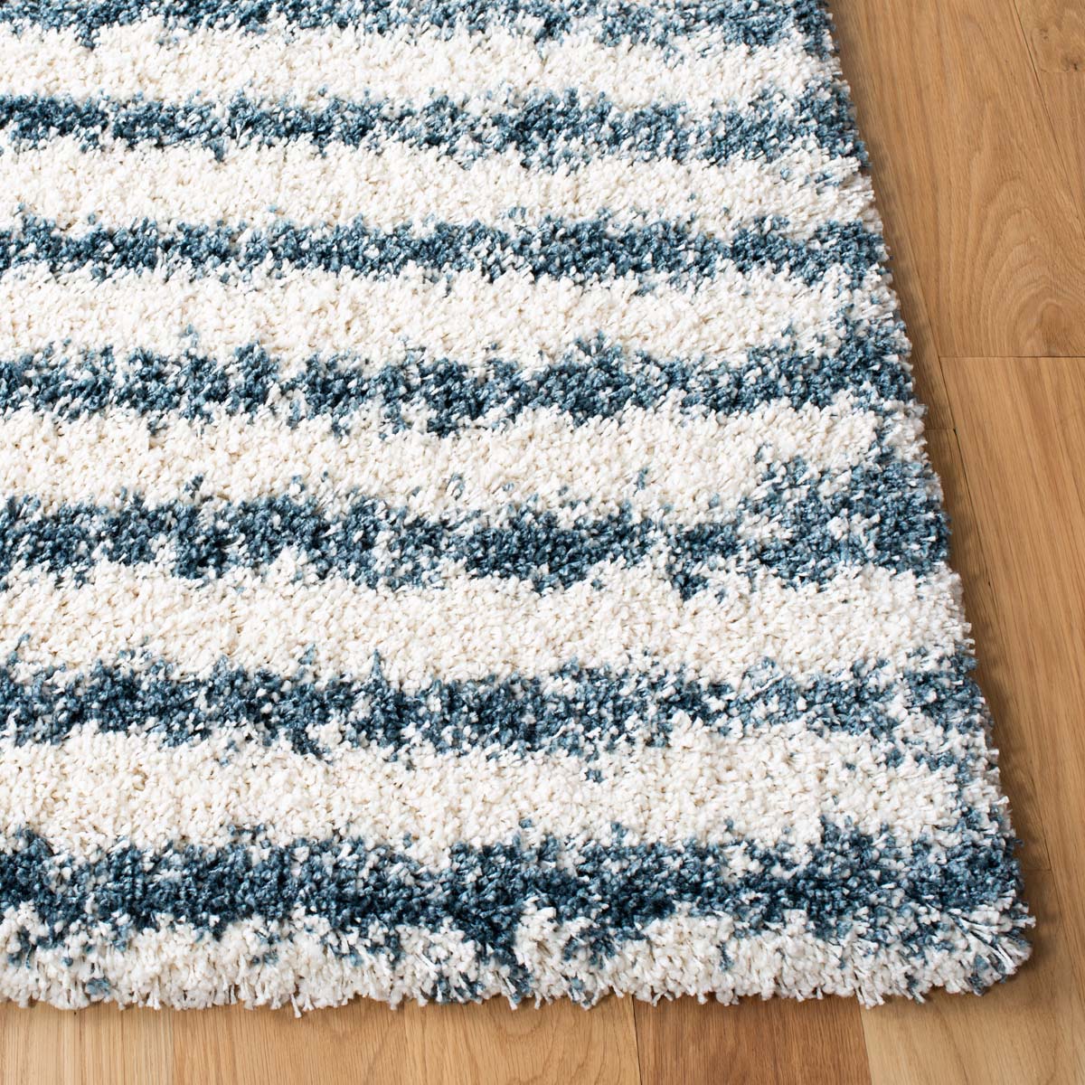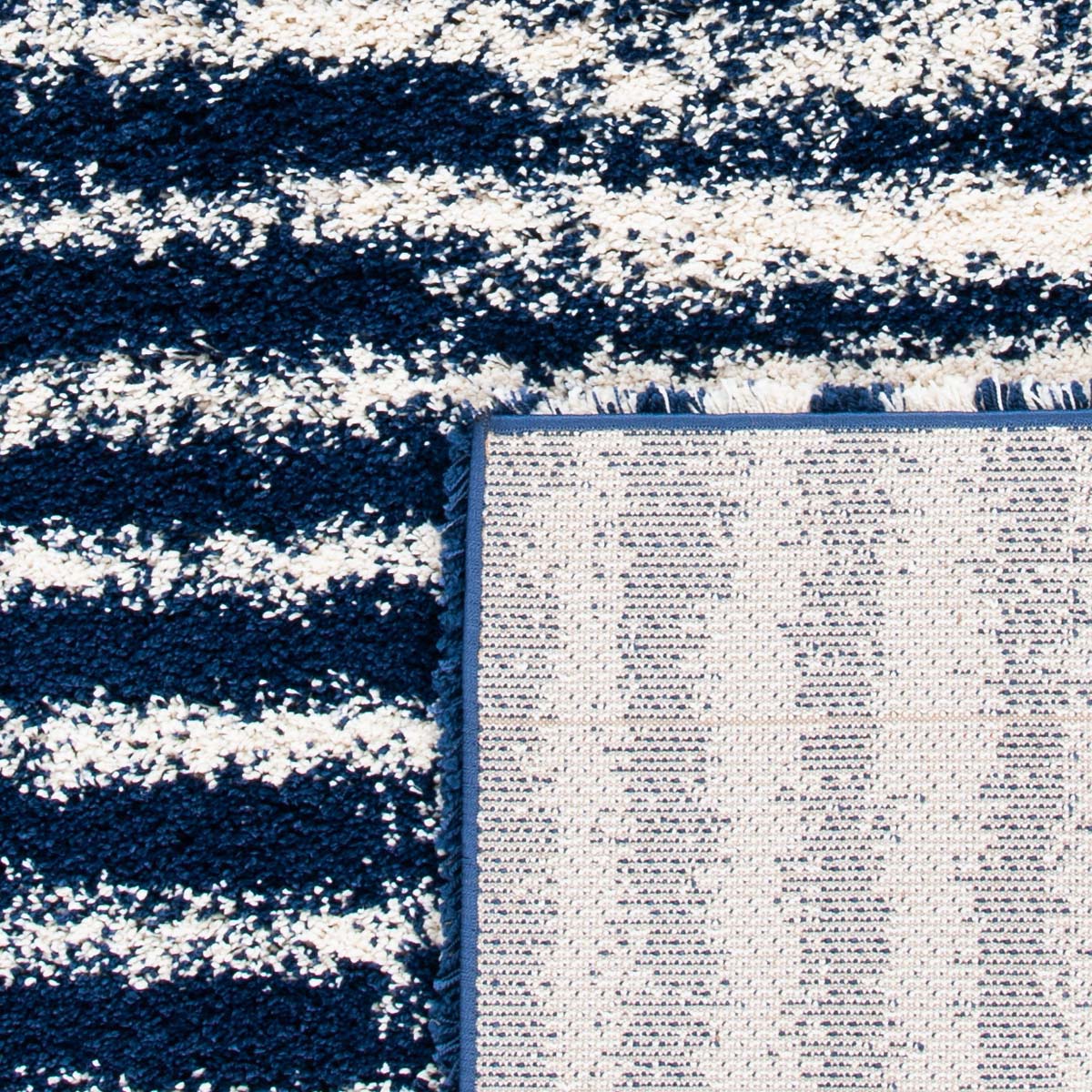 Introducing our plush and contemporary 3' X 5' small rectangle area rug, a beautiful addition to any room seeking a modern touch with a cozy feel. The bold navy and ivory hues blend harmoniously, featuring an engaging striped pattern that exudes a sense of rhythm and movement across the floor space.