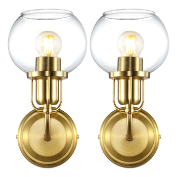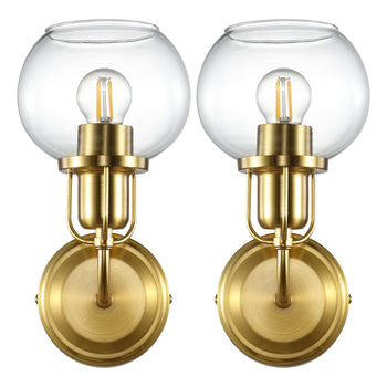 Enrich your home with the luxury and elegance of our Huron wall sconces. Polished brass and clear glass come together to deliver a refined and sophisticated light fixture for your interior walls. Adorned with elegant details, a brass arm stands upright to hold our clear glass shades. An epitome of grace, the light fixture creates a stunning display of the bulb to deliver a warm and ambient glow.