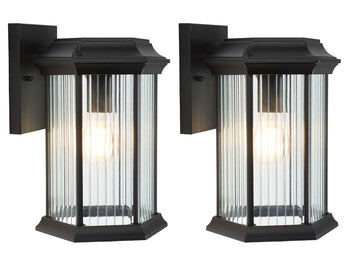 Beautifully displaying classic taste with a contemporary edge, this Hylan Outdoor Wall Sconce revitalizes any outdoor living space. Hylan's fluted glass panes are artfully offset by its lantern-inspired silhouette, while a jet black finish completes the look. Sold in sets of two.