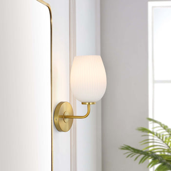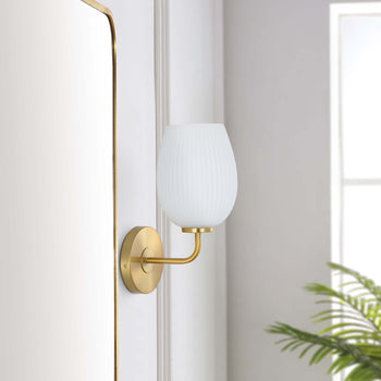 The perfect finishing touch for any interior, this Idina Wall Sconce is a modern must-have. Idina's white frosted glass shade casts a warm, gentle glow, beautifully enhanced by the shimmering brass finish of its arm and base.