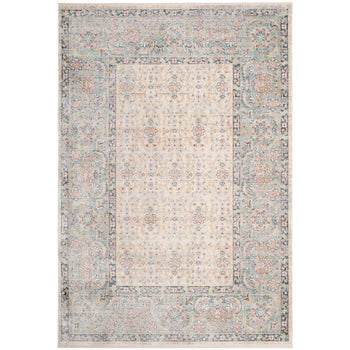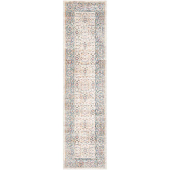 The rug showcases a beautiful and harmonious pattern that combines timeless motifs with a serene color palette. The design features intricate detailing with hues of soft cream and light blue accented by subtle touches of warm and cool shades, giving a sense of depth and dimension to any space.