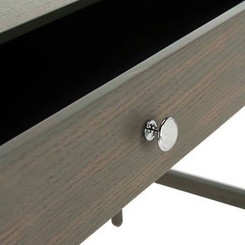Add uplifting vintage style to any office with this midcentury modern desk. Designed with a fresh ash grey finish, its modern lines and polished chrome hardware blend form and function. Its oversized drawer keeps clutter to a minimum for a clean workspace.