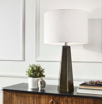 Statuesque and modern, this Jandean Table Lamp is a new style icon. Jandean's antique brass finish perfectly complements its tapered geometric column base, and a cream cotton shade completes the look.