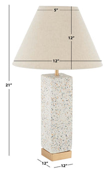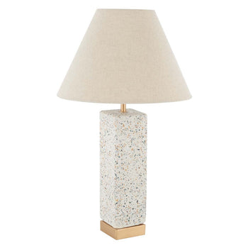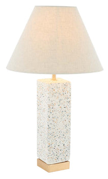 Jazz up your room with the playful aura of the Jannise table lamp. The concrete body of the table lamp is enriched with stone fragments to showcase lively and vibrant textures. Featuring a rectangular body accented with gold and an elegant empire shade, our table lamp vouches for a sleek and stylish look. It is sure to add a lively spark to your bedside, desk, console, or end table.