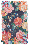 The rug is thoughtfully constructed from a premium blend of 80% wool and 20% cotton, providing the perfect balance of warmth and breathability, ideal for any season. It features an enchanting color palette of deep navy and vibrant pinks which create a captivating backdrop for the lush floral design that adorns its surface. Each petal and leaf is intricately hand-tufted in India by skilled artisans, ensuring that every piece is truly unique.
