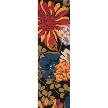 Showcasing a captivating floral pattern that blooms with luxury, each flower is intricately designed to stand out against the deep black background. The bold, vibrant hues nimbly play in a stunning symphony of colors, featuring fiery reds, cheerful yellows, serene blues, and soothing purples, complemented by an earthy palette of tans and browns. This detailed pattern exudes sophistication and a timeless appeal that will enhance your floor and enliven your decor.