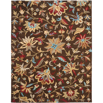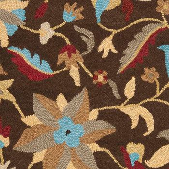 The rich brown background of this piece sets the stage for a stunning, multi-colored floral pattern that features an array of harmonious hues, including touches of red, blue, ivory, and gold tones. Each bloom and swirl is meticulously tufted by skilled artisans, resulting in a distinctive rug that is as durable as it is beautiful.