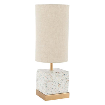 Add a modern and lively flair to your home with the Jarelle table lamp. The concrete base of the table lamp is speckled with stone fragments to serve as a playful and welcoming addition to your home. Its tall drum shade creates a sleek contrast with the rectangular concrete body. Accented with a gold metallic finish, the table lamp showcases a dramatic play of textures, shapes, and proportions to enliven any bare surface of your home.