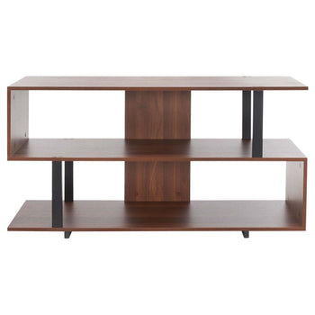 Give your entertainment unit a modern and architectural appeal with our small Jarrett media stand. The zigzag profile of the media unit is upgraded with clean and crisp lines. Accented with black metallic supports on opposite ends, our media stand invites an elegant visual play. It is enriched with organic grains of wood in a deep walnut brown shade to warm up your living space. The open shelves of our small and space-friendly media unit open up your living area with ample space to hold your media equipment and storage.