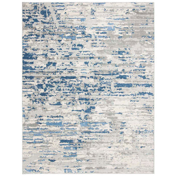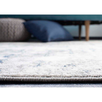 The rug's distinctive pattern, illustrated in the image, features an abstract blend of ivory and blue hues, creating a mesmerizing visual effect that is both modern and versatile. This piece of art for your floor will seamlessly complement a variety of interior designs, acting as a focal point or a subtle complement to your existing furniture.