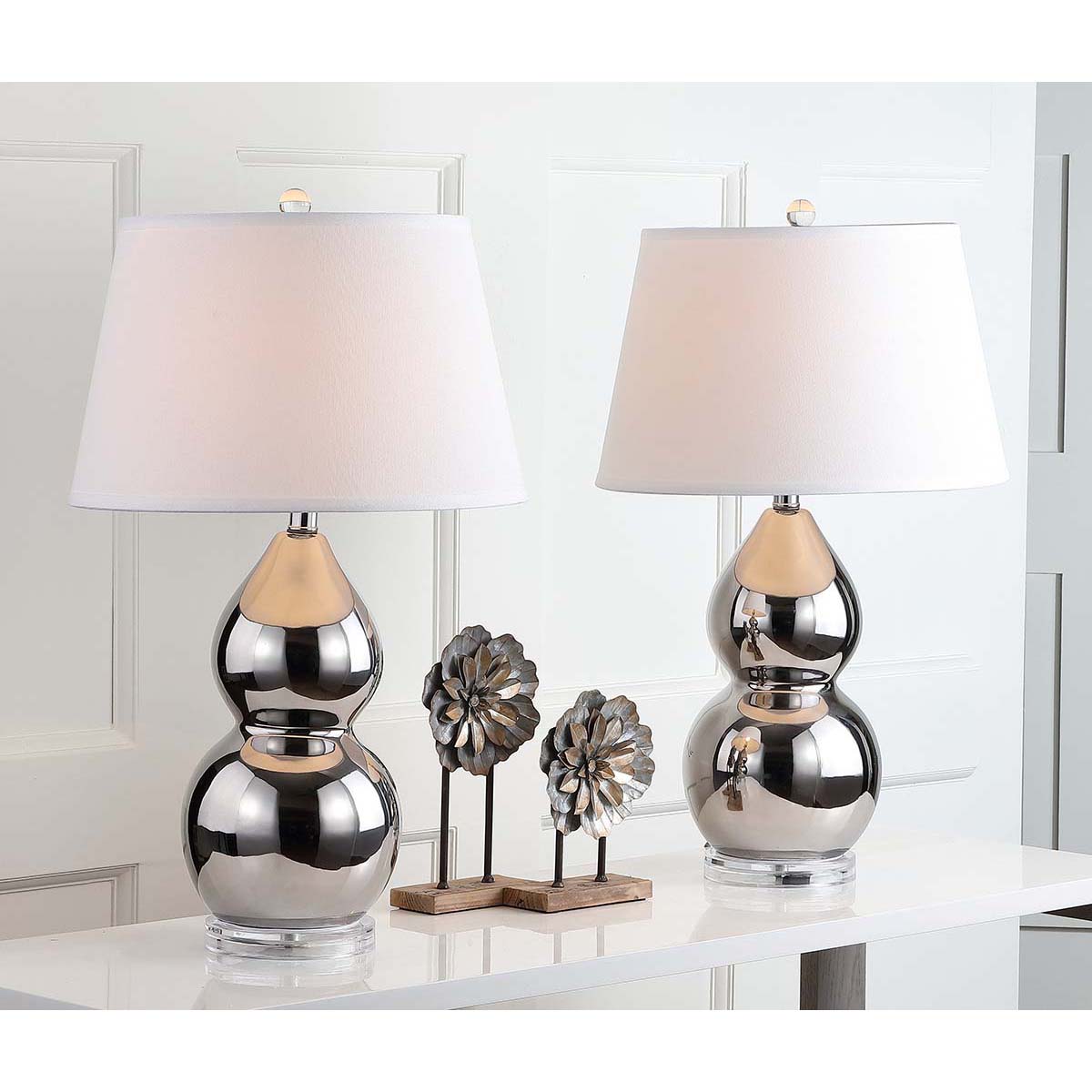 Refresh your living room, bedroom, or den with the classic elegance of the Jill Double Gourd Lamp. Shown in silver with matching stand and fittings, this gracefully curved ceramic lamp is paired with silver rimmed cotton shade for a rich transitional look. Sold in sets of two.