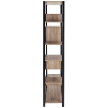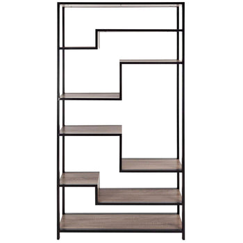 This designer Mid Century Joanna Etag?re was created for the educated eye. Meticulously crafted with a smooth oak finish, its stylish flowing lines create a captivating sense of movement, perfectly embodying geometric modern art. Ideal for a grand display of treasures large and small.