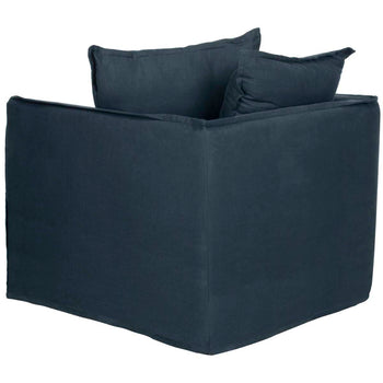 Simple lines, slender boxy frame, and narrow arms fabulously contrast the generously stuffed cushions of the Joey Arm Chair. Crafted from birch wood and wrapped in a dark blue blend of linen and cotton, Joey evokes shabby chic slip covered furniture in updated, go anywhere style.
