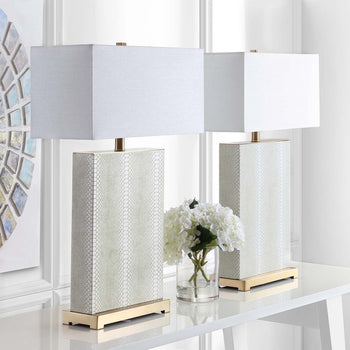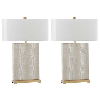 Designed to evoke the Deco style of New York's Chrysler building, this Joyce Faux Leather Table Lamp (set of two) brings high fashion to any interior. Joyce's geometric texture and sleek, angular style create a cosmopolitan classic that sets the tone for tasteful living.