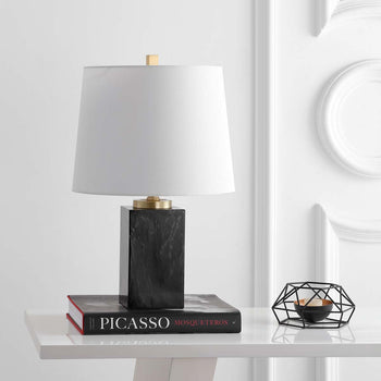 Bold and beautiful, this contemporary table lamp adds luxurious style to any living room. Designed with the timeless elegance of a dramatic black marble finish, its brass gold foundation shimmers underneath an off white cotton shade.