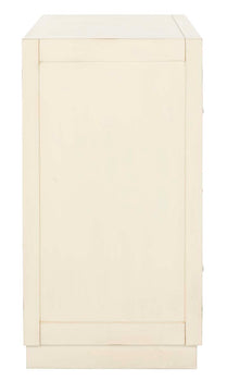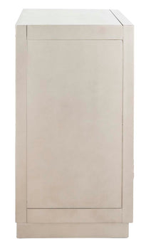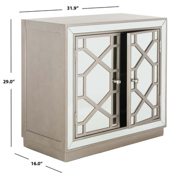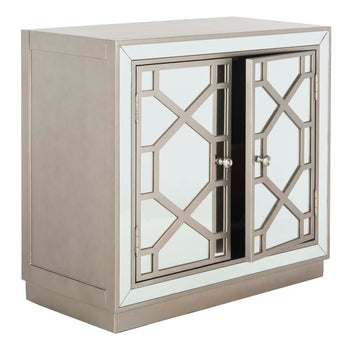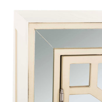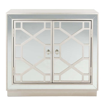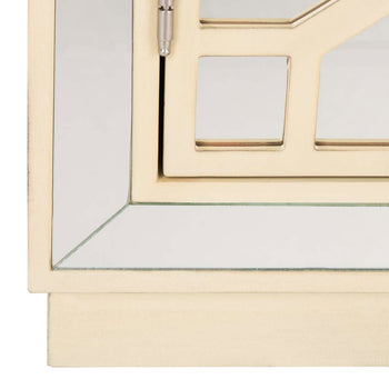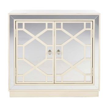 A new spin on Hollywood regency style, this Juniper Chest brings instant luxury to any room. Juniper's bold geometric Chinoiserie pattern features an antique beige finish that highlights the shimmering mirror panels on its two doors.