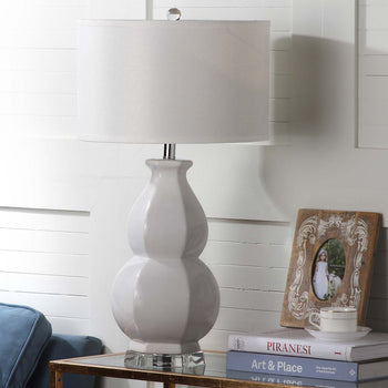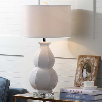 A classic double gourd ceramic base gets a fashion update with faceted detailing in the navy blue Juniper table lamp. This striking transitional lamp is finished with textured white cotton drum shade and modern see through acrylic pedestal and finial.