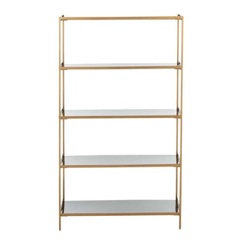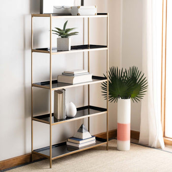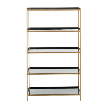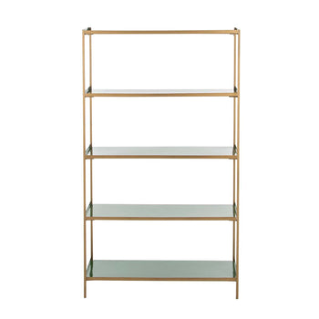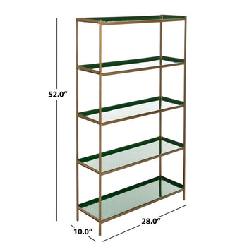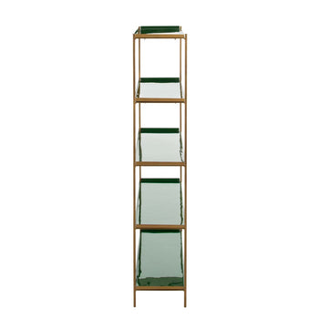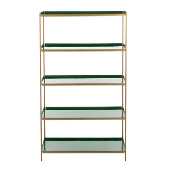 Tall, dark and handsome, this dramatic 5 tier ?tag?re brings modern luxury to the living room. Its statuesque form was designed to blend style and substance with its sophisticated green shelves, sleek brass finish and generous layers of open storage.