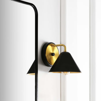 This Jynn Wall Sconce was designed for the cosmopolitan lifestyle. Fresh and fashion-forward, Jynn's sleek black shade and shimmering brass base give your Decor a penthouse-chic glow, instantly transforming any interior with effortless style.