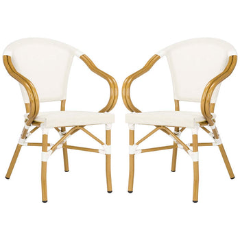Inspired by the classic bamboo peacock chair, this set of two Karine arm chairs by Safavieh is treated to state of the art materials for outdoor use. Crafted with aluminum frame and beige Textilene fabric, this easy care design is pretty and practical.