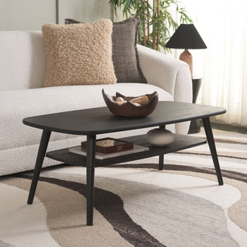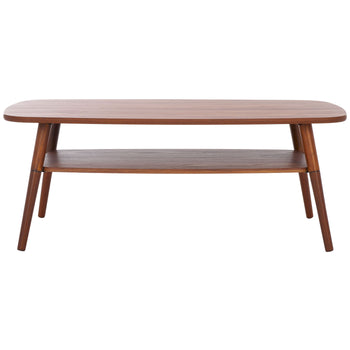 Uplift any corner with the modern charm and rustic appeal of our Karou coffee table. Our mid-century-inspired coffee table enlivens your space with its effortless style and warm elevating tone. Its rectangular tabletop is finished off with rounded edges to attain a soft and inviting look. Tapered legs complete the sleek and modern profile of the coffee table. It showcases the organic grains of wood in a rich finish. Our coffee table includes a lower shelf to provide ample space for both display and storage.