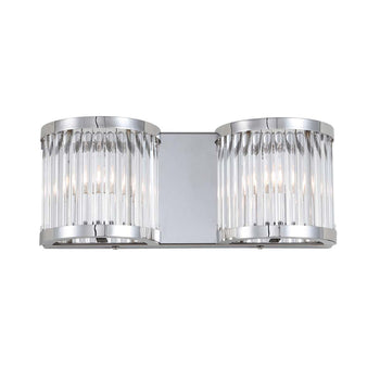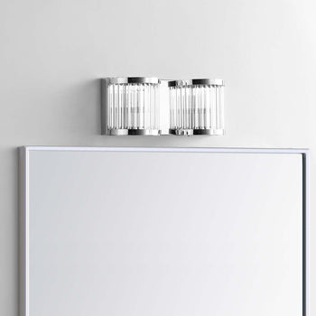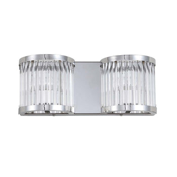 A stunning display of elegant symmetry, the Karter Two Light Wall Sconce is the Gatsby gala of lighting. Casting the ambiance of a starlet’s dressing room, the smooth, curved chrome finish of this sleek light fixture showcases is undulating glass shade and Art Deco influences.