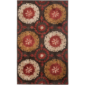 The rug features a captivating pattern, harmoniously weaving together bold, circular medallions and intricate floral motifs. The central medallions provide a visual anchor with their alternating color scheme of beige centers encased in vibrant red and soft brown, radiating a rustic yet sophisticated allure.
