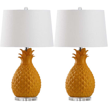 A long standing symbol of hospitality, the pineapple is recreated in saffron yellow resin in the Kelly table lamp. Welcoming in transitional and coastal interiors, this lamp is accented with a textured white cotton drum shade and acrylic base and finial.