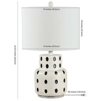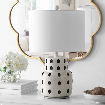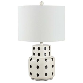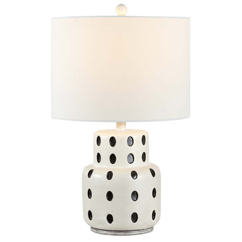 Give your decor a soft touch of whimsy with this Kencia Table Lamp. A geometric stylization of the classic gourd silhouette, Kencia's streaming indented black dots over soft cream resin resound with a decorative sense of motion.