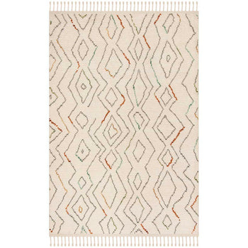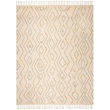Originating from the historic weaving centers of India, this area rug comes with a heritage of skilled artisanry. Its stunning ivory base is adorned with a refined geometric pattern, infused with subtle pops of color that provide a tasteful and versatile visual interest. The pattern features a sequence of diamonds and angular lines that evoke a sense of tribal-inspired modernity.