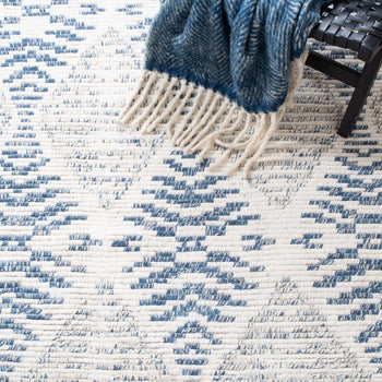 The rug's pattern, as seen in the image, is a captivating display of intricate geometric forms that draw inspiration from traditional motifs. The rhythmic pattern of stylized foliage is rendered in a harmonious color palette of blue shades set against an ivory background, delivering an elegant aesthetic that seamlessly integrates with various decor styles. This artisanal piece is not only aesthetically pleasing but also built to endure the test of time, thanks to its hand-knotted wool construction, known for its exceptional strength and softness.