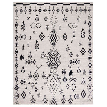 This rug features an enchanting pattern that draws inspiration from classical motifs. The intricate details of the design, visible in the image, suggest a tapestry of geometric and abstract figures, harmonious in arrangement and balanced in form. Each element ? from the bold central diamond to the symmetrical arrangements of tribal symbols ? is carefully hand-knotted to create a narrative of visual intrigue.