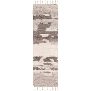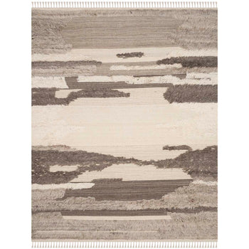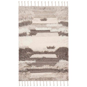 The rug features an engaging pattern with varying shades of ivory and grey, creating movement and depth that will complement a variety of interior decors. The unique textural details, evidenced in the image, add character and dimension, making each piece truly one-of-a-kind.
