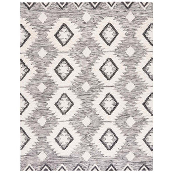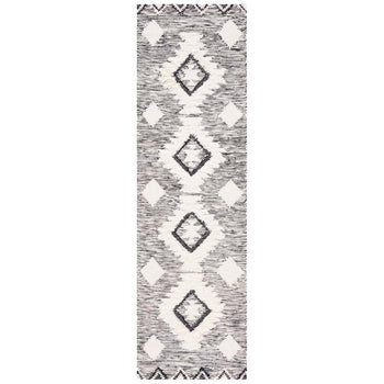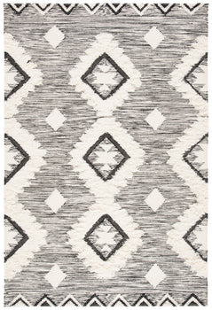 Featuring a refined color palette of black and ivory, this rug presents a harmonious balance that can seamlessly integrate into any decor. The striking pattern depicted in the image is a testament to the artistry and craftsmanship embedded in every thread. Central geometric diamond motifs, interspersed with textured details and crisp lines, create a visual interest that captures the essence of contemporary design while maintaining a classic appeal.
