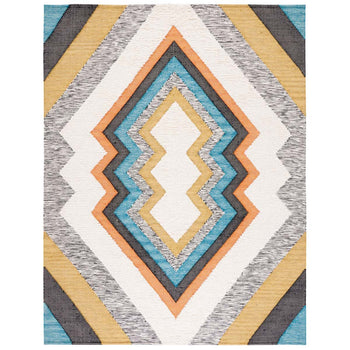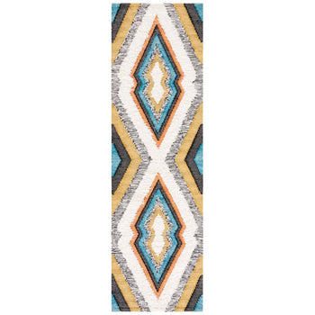 Our Black/Ivory runner showcases a harmonious pattern inspired by tribal motifs, accentuated by a vivid array of colors including black, ivory, teal, orange, and a subtle mustard yellow, forming geometric diamonds that draw the eye along its length. The contrasting hues are balanced with neutral tones that ensure this piece can complement a variety of interiors.