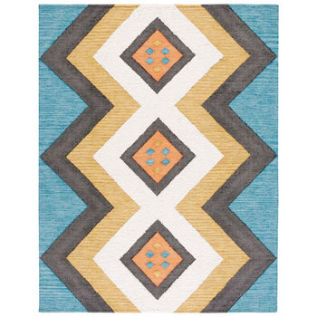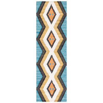 The design of this runner is highlighted by a captivating pattern, as illustrated by the provided image. It features harmonious geometric motifs framed by bold lines, forming a dynamic rhythm throughout the length of the rug. The central diamonds, filled with warm shades and pops of blue, create focal points that are both inviting and stylish.