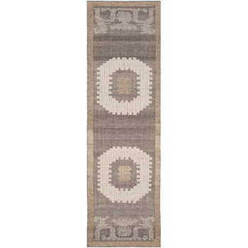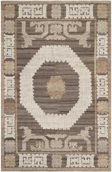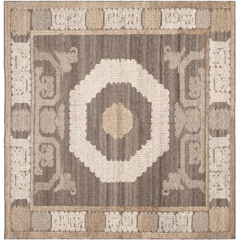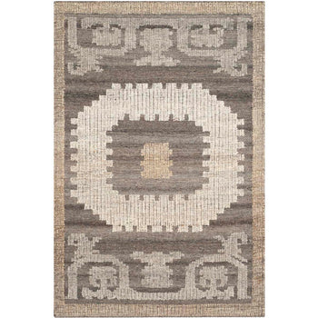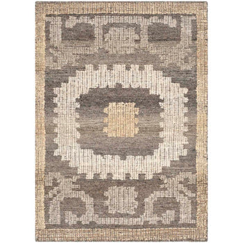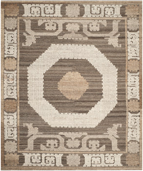 Capturing the essence of sophistication, the rug features an elegant ivory and brown color palette that adds a warm, neutral touch to any room. Its unique pattern, as observed in the image provided, intertwines organic and geometric motifs creating a central medallion surrounded by intricate border designs, offering a contemporary twist on classic aesthetics.