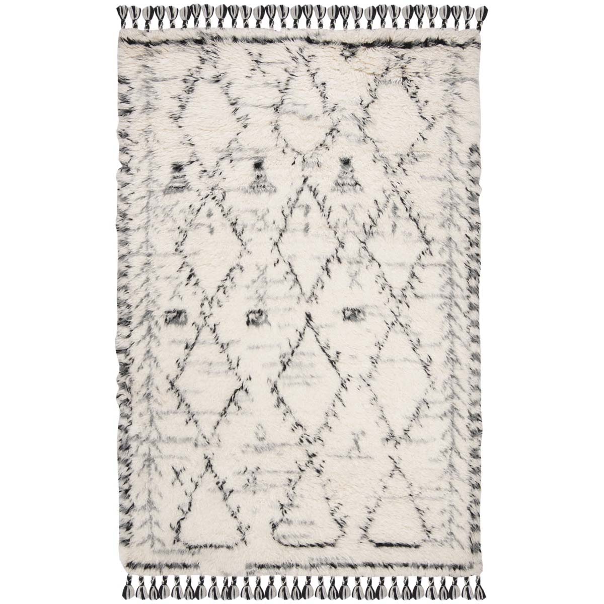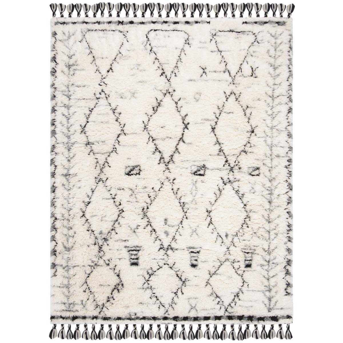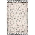 This rug features a modern interpretation of tribal patterns, boasting a striking ivory and black color palette that will complement any room. The design showcases a series of geometric motifs and diamond shapes that create a sense of rhythm and movement across the rug's surface. The patterns are balanced with a touch of contemporary style, making this rug versatile for both modern and traditional interiors.