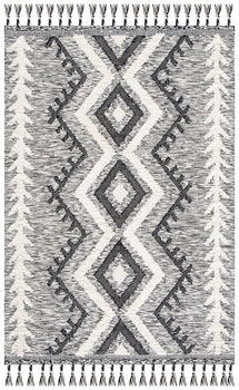 The eye-catching pattern displayed in the image shows an intricate array of geometric shapes and tribal-inspired motifs that make this rug an instant focal point. The neutral ivory background is boldly contrasted with black details, ensuring this rug offers both versatility and visual impact.