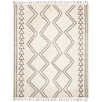 Showcasing a captivating ivory and black color palette, the rug's design features a harmonious pattern of geometric shapes and bold lines, creating a visual allure that draws the eye and anchors your room. The distinctive pattern, while shown here regardless of its size in the image, is perfectly scaled to add visual interest and texture without overwhelming your space.