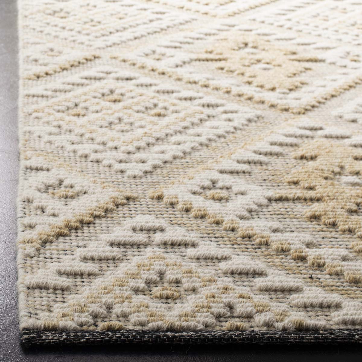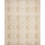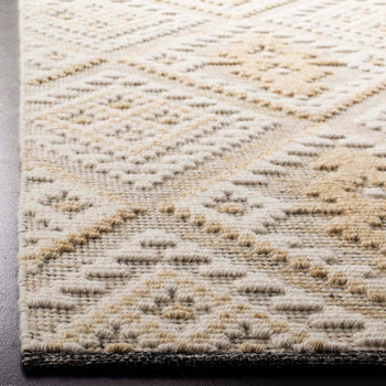 Featuring a chic and versatile ivory backdrop with captivating gold accents, the rug's pattern, inspired by the image provided, offers a harmonious geometric diamond motif that boasts both sophistication and charm. The intricate designs are a testament to the age-old techniques employed by skilled artisans, making this rug a testament to craftsmanship and aesthetic appeal.